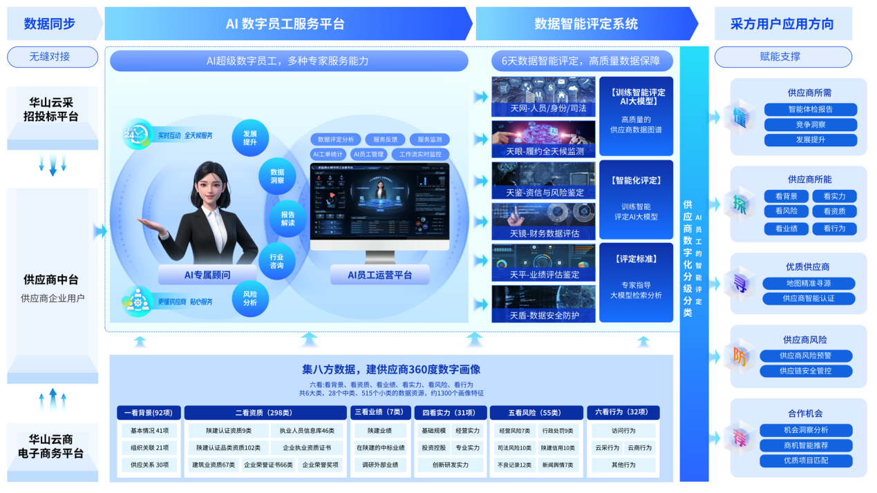 陕建AI数字员工创新平台项目以“破解供应链痛点、释放数据要素价值、构建新质生产力”为核心目标,通过创新应用场景与构建高质量数据集,为AI数字员工提供全流程数据支撑,实现数据驱动业务智能。最显著的技术优势在于跨界融合多方数据,提炼出全面且高质量的建筑行业产业级数据要素,并通过AI 大模型、3D数字人技术的创新运用,围绕供应链场景进行智能体构建和客户端打造,成功训练和研发出能够达到具体供应链岗位专家水平的AI 数字员工,形成真正的生产力,通过这一模式能够充分地激活数据价值、促进跨界数据融合、实现价值共赢,建立起一个良好的数据合作生态网络及价值共赢链路。项目的宏观蓝图由“2大平台+1套模型矩阵+1套评定系统”组成,服务6方主体企业。通过数据融合平台采集、清洗、提炼、加工、整合各方的数据汇集到“灵镜”大模型矩阵,并通过数据评定系统的数据鉴定、指标评估及模型验证,将高质量的数据输送给AI数字员工平台,训练和打造场景化的AI员工,为采购企业、供应商企业、金融机构提供“岗位化”服务;并通过与数据交易所的合作,促进数据的挂牌和交易,帮助平台和数据合作伙伴实现数据变现价值,最终形成6方的生态合作共赢模式。