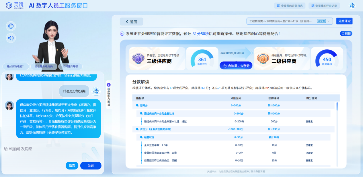 项目核心是基于“灵镜”大模型的数据模型体系、数据智能评定系统和AI数字员工,建立了一套先进、成熟的面向供应商领域的数据要素提炼和智能化应用路径,其关键技术突破在于模块化、参数化、层次化、可配置的数据要素体系设计。例如,通过调整数据指标维度,即可快速适配不同行业供应商评价的核心指标体系。为项目向能源、交通、制造等同样拥有复杂供应链体系的行业推广奠定了坚实基础。同时,项目方案并非孤立模块,而是贯通了建筑供应链核心场景,涵盖招投标前的智能寻源、资格预审、风险初筛,履约中的实时绩效监控、质量追踪、风险预警,评估后的动态分级分类、资源优化配置、战略合作筛选,以及金融赋能的信用评估、融资授信等多个环节。这种端到端的场景覆盖能力,确保了解决方案的完整性和价值闭环,使其在目标行业内部具备极强的推广黏性。项目已覆盖全国各省份、165+细分行业的建筑材料和施工服务企业,年平台交易额超千亿元,充分证明了项目跨企业、跨区域协同的可行性与有效性。