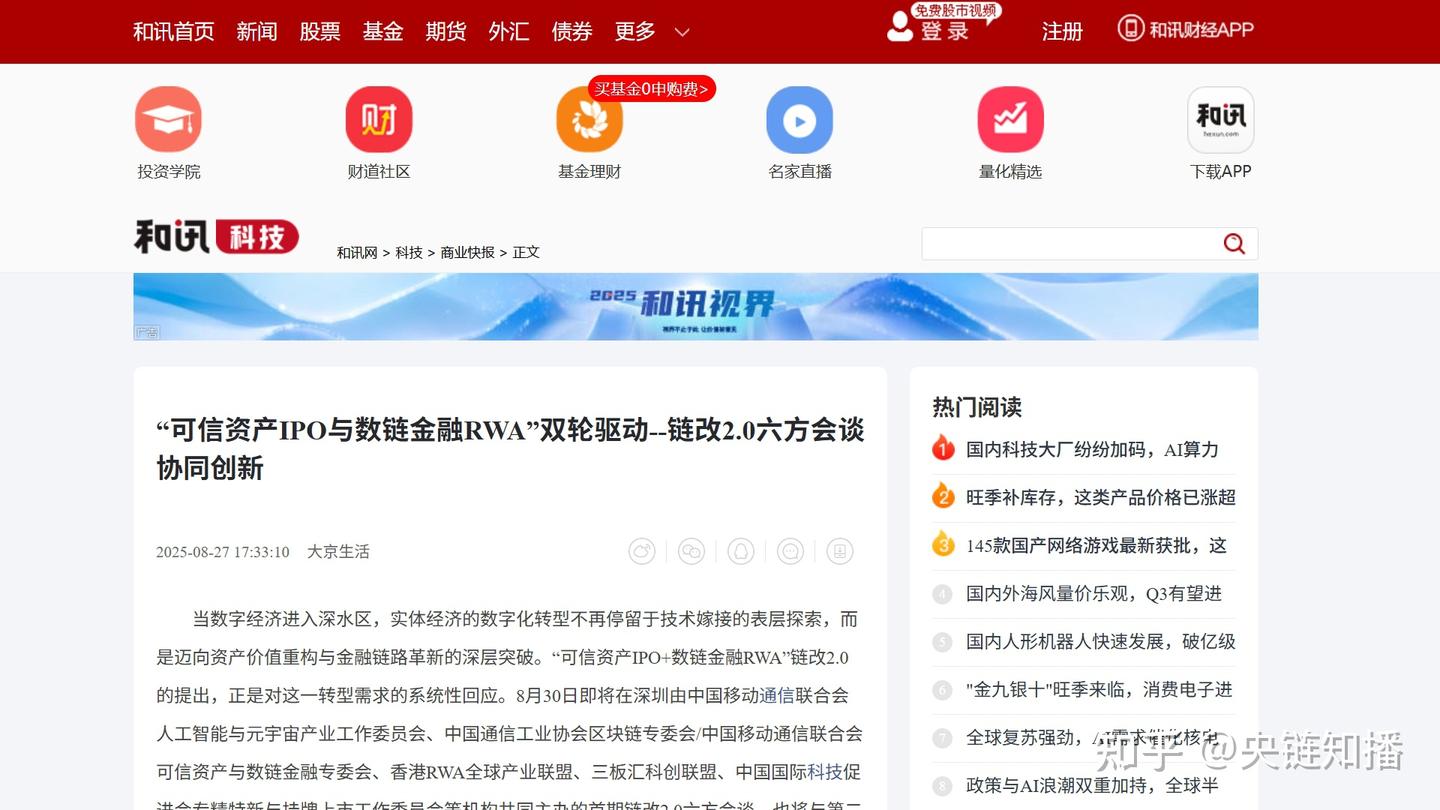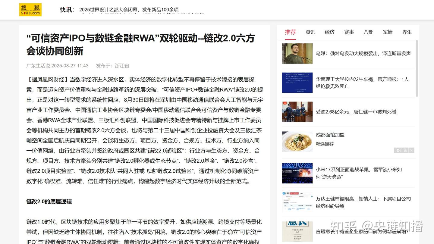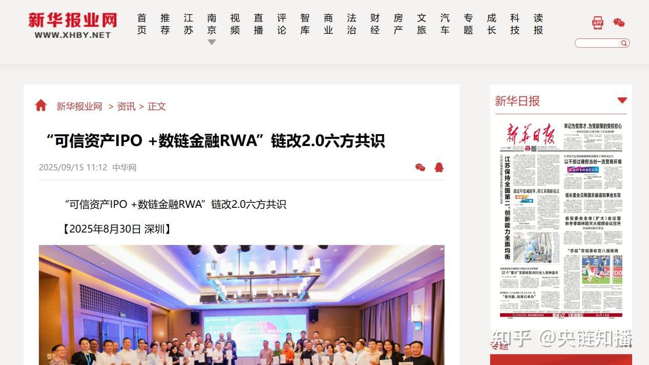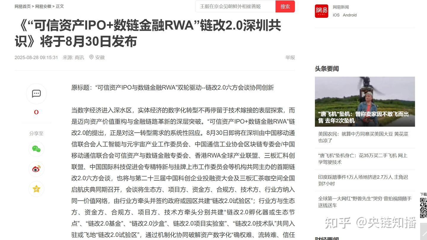 2025 年 8 月 30 日,“可信资产 IPO + 数链金融 RWA” 链改 2.0 六方共识在深圳重磅发布,随即引发新华报业网、飞象网、搜狐、和讯网、网易、凤凰网财经等国内主流网络平台的集中聚焦。从权威资讯传播阵地到垂直领域核心平台,从综合新闻门户到专业财经矩阵,全方位、多维度的关注热潮奔涌而至,强势印证了这一共识在数字经济与实体经济融合领域的标杆性影响力,借助各大平台的广泛传播力,其创新价值正迅速辐射至产业界与社会各界视野。
