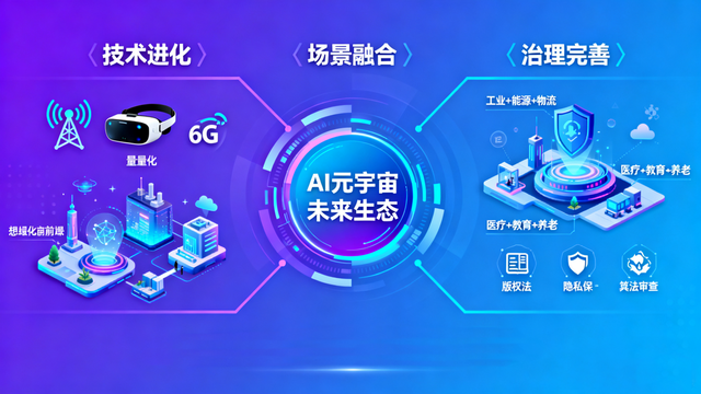 技术发展将向"自主进化+普惠化"迈进。核心技术将加速突破,AI大模型与元宇宙场景的深度融合,将实现场景的自主生成、动态优化,推动"人机共创"的场景构建模式;硬件设备将向轻量化、低成本、高沉浸方向发展,随着技术成熟,VR/AR设备将逐步普及,成为场景交互的常用终端;算力网络将迎来升级,"东数西算"工程的推进将优化算力资源配置,5G-A、6G技术的发展将解决网络延迟问题,为场景规模化落地提供支撑。同时,技术标准将逐步统一,行业协会与企业将共同制定AI算法、场景建模等规范,推动生态协同发展。