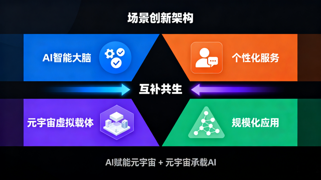 AI与元宇宙的技术融合,形成了"智能大脑+虚拟载体"的场景创新架构:AI为元宇宙提供智能决策与个性化服务能力,元宇宙则为AI技术提供规模化应用场景,两者互补共生,共同构成场景革命的核心驱动力。