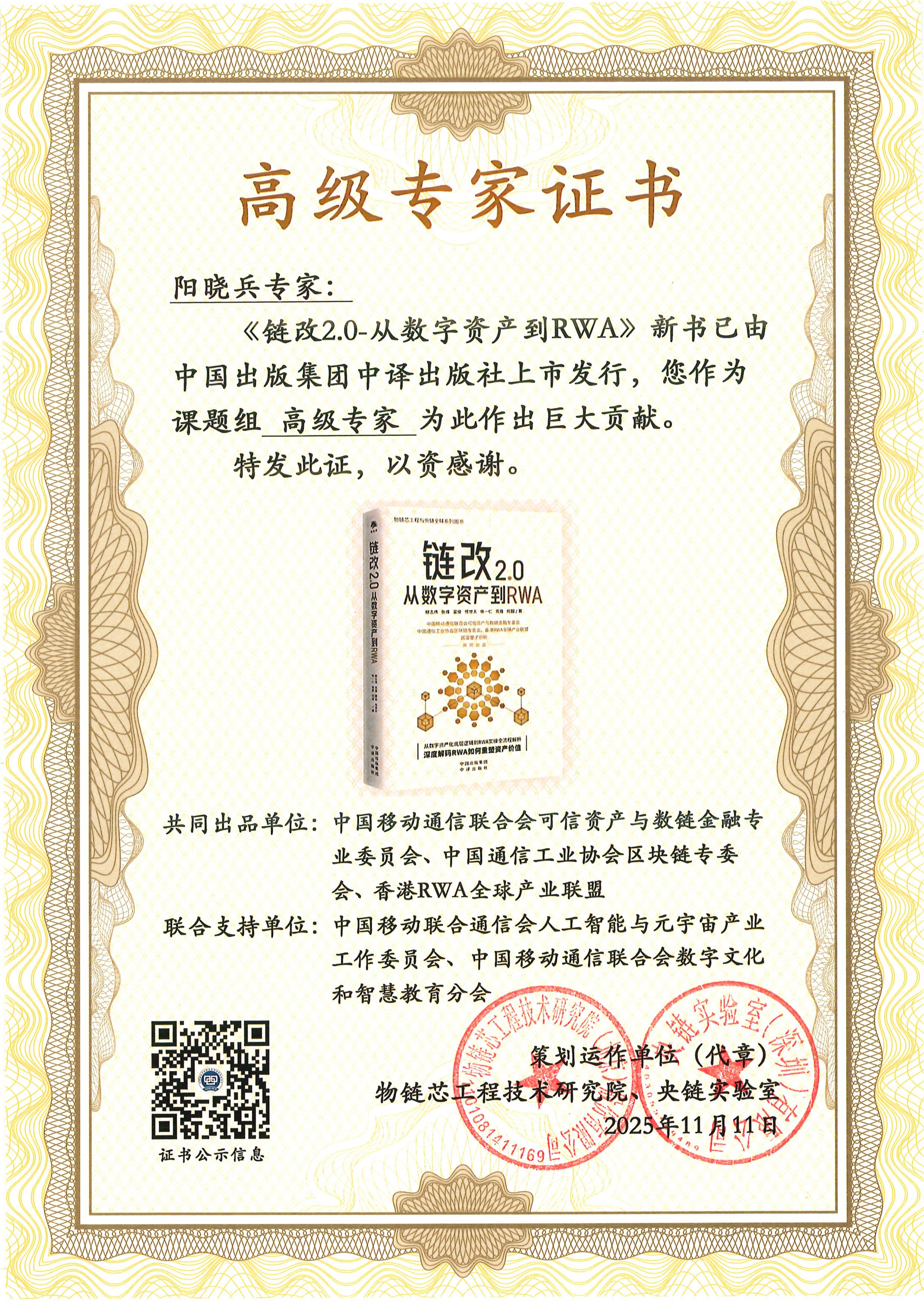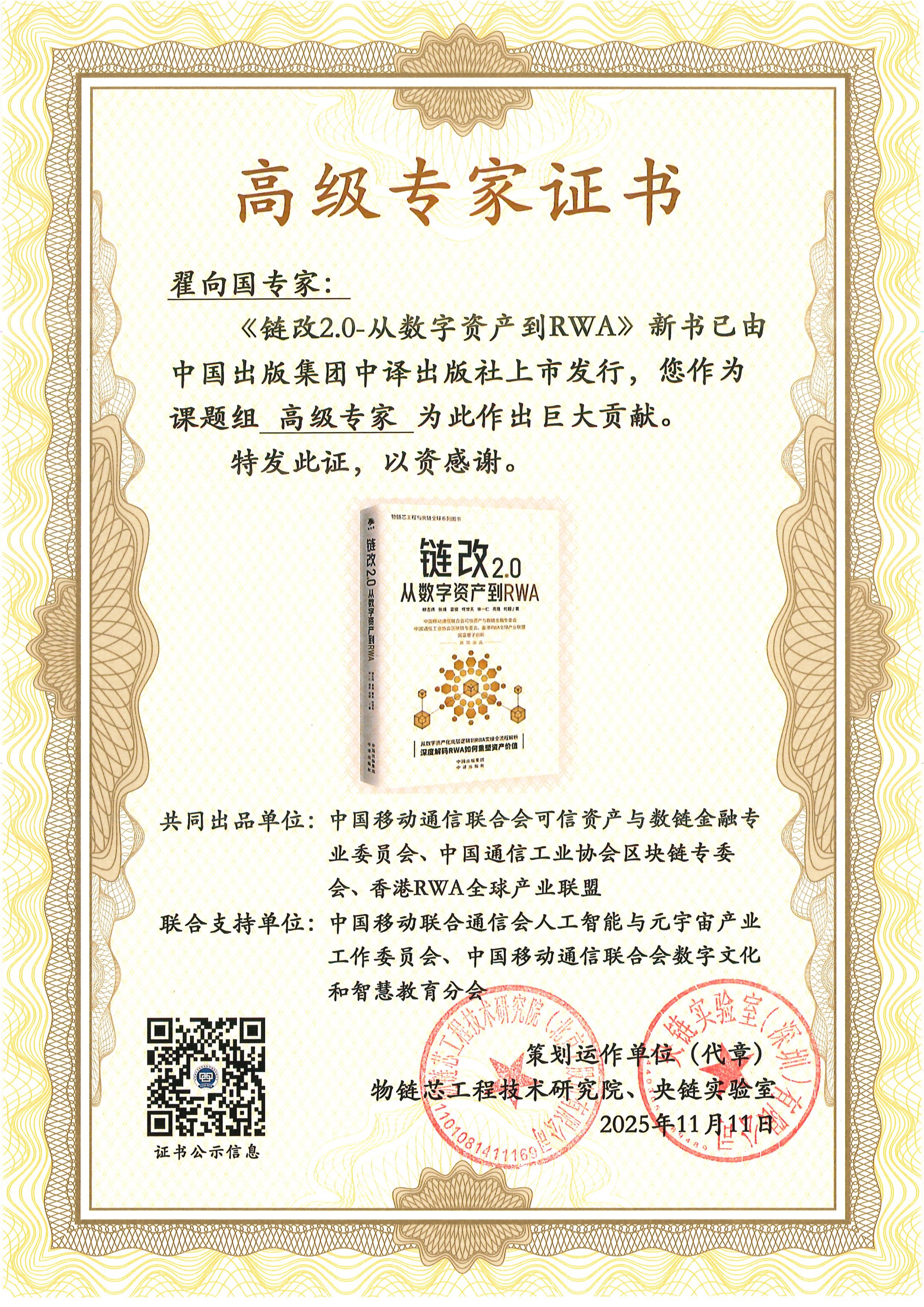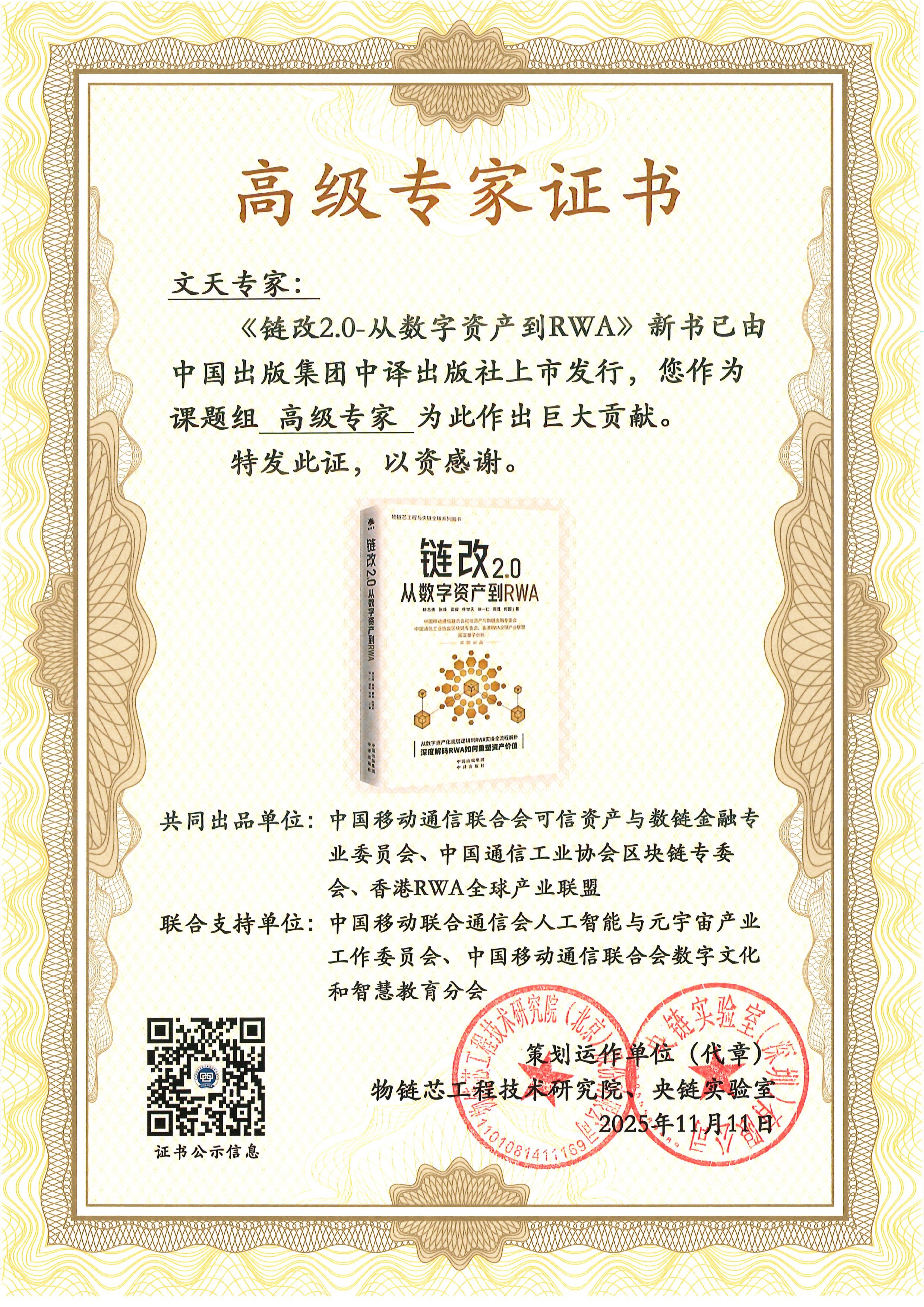 《链改 2.0——从数字资产到RWA》新书重磅上市 首批36位行业专家获颁高级专家证书
