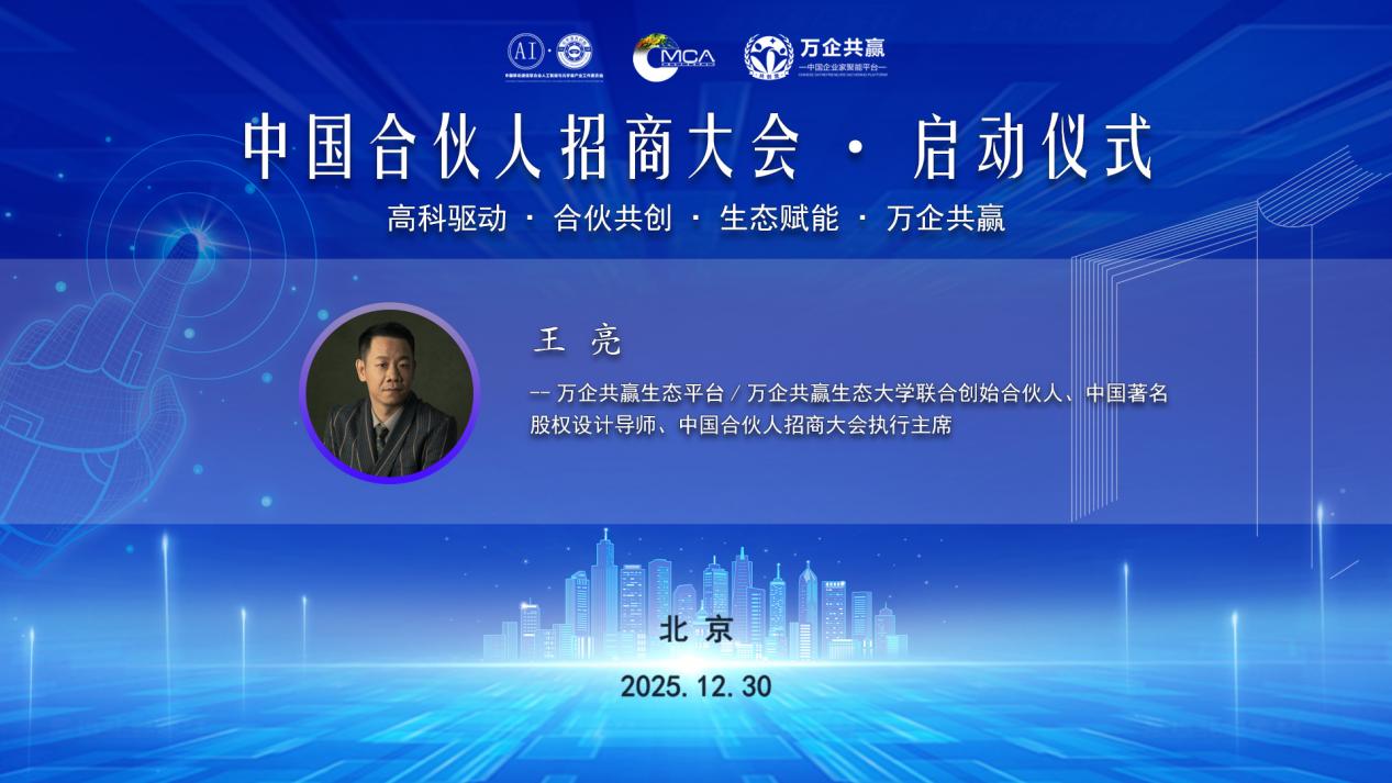 (央链速播北京讯)近日,2026中国合伙人招商大会启动仪式在北京隆重举行。大会以“高科驱动・合伙共创・生态赋能・万企共赢”为核心主题,聚焦AI、元宇宙、区块链等新兴产业赛道,正式发布全国战略新兴产业合伙人体系,为“十五五”开局之年的产业协同发展注入强劲动力。万企共赢生态平台/万企共赢生态大学联合创始合伙人、中国著名股权设计导师、中国合伙人招商大会执行主席王亮出席仪式并发表致辞,明确启动全国合伙人招募计划,以实在的盈利体系与全面的扶持政策,与合作伙伴共同将生态红利转化为产业实效。