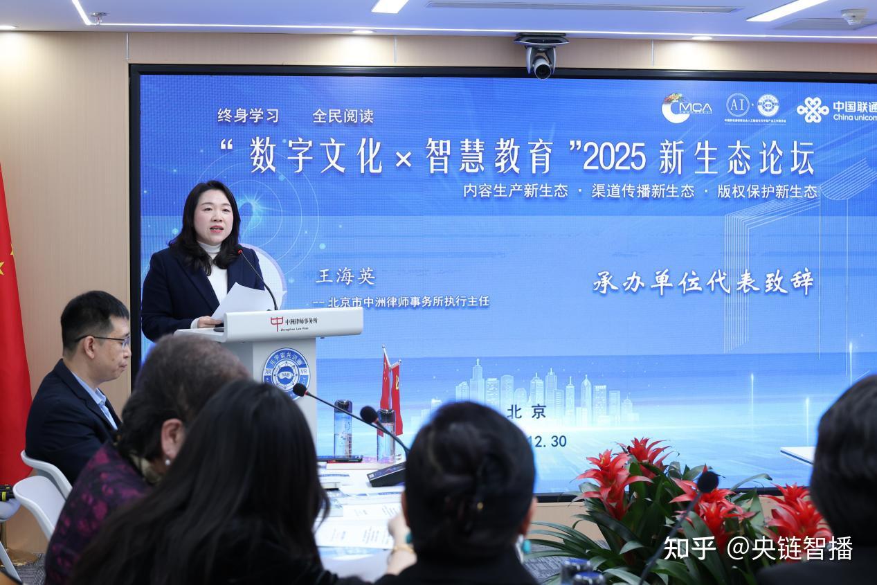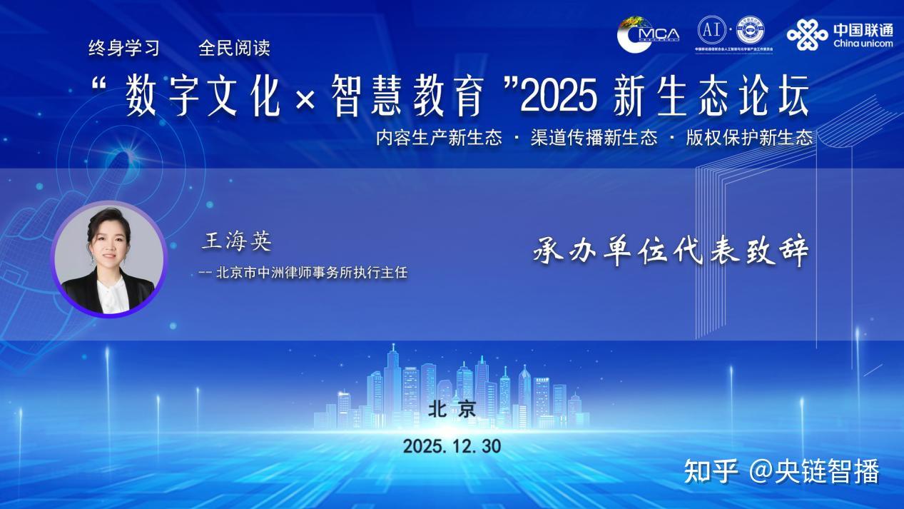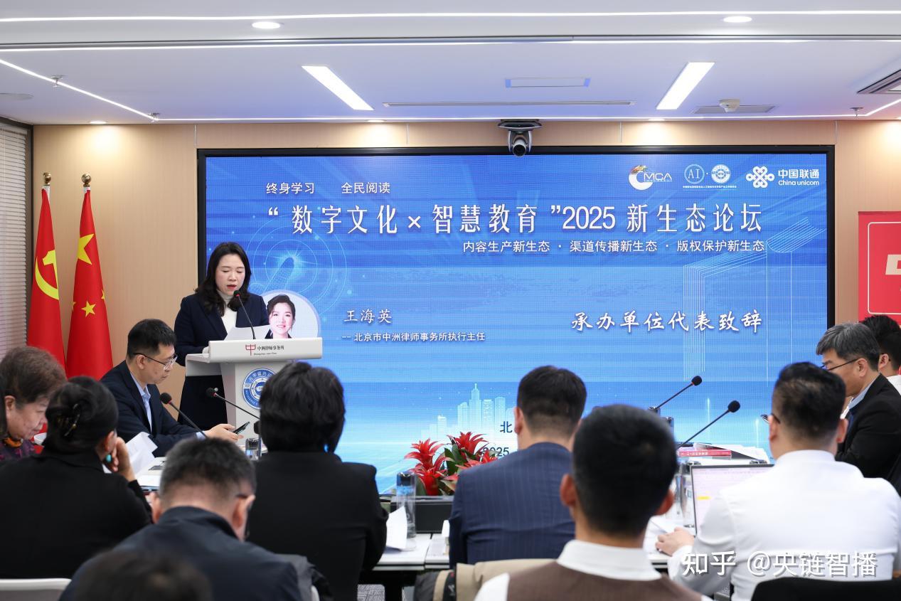 (央链速播 北京讯)近日,“数字文化×智慧教育”2025新生态论坛在北京隆重召开。中国通信工业协会区块链专委会执行主任委员单位、中国移联可信资产与数链金融专委执行主任委员单位、中国移联AI元宇宙产业委常务副主任委员单位,北京市中洲律师事务所执行主任王海英作为承办单位代表出席论坛并发表致辞,强调法律护航对数字文化与智慧教育产业创新发展的核心价值,为产业生态提供全周期专业法律服务。