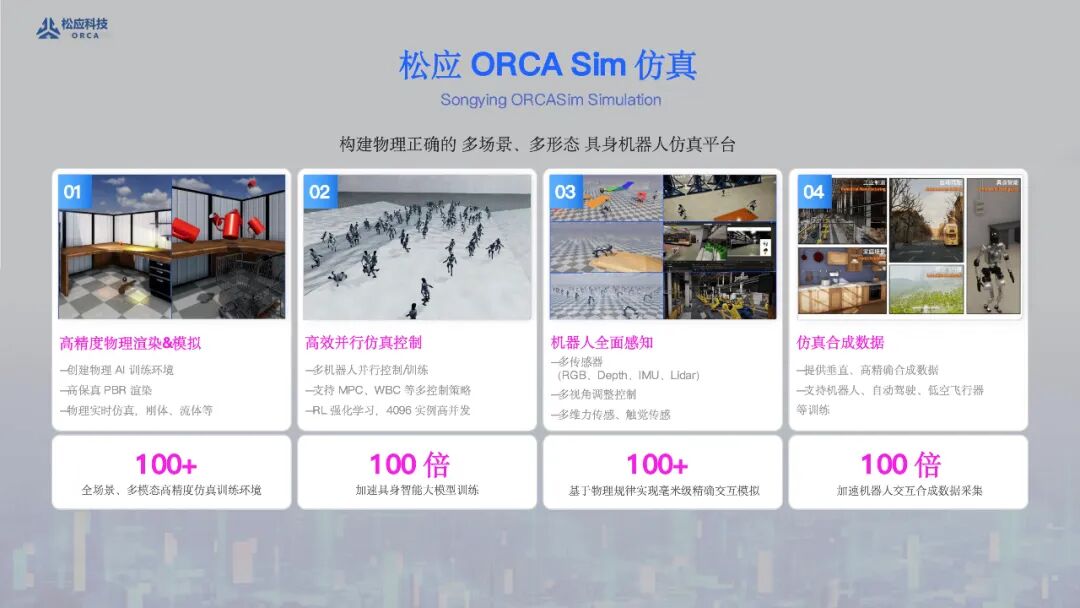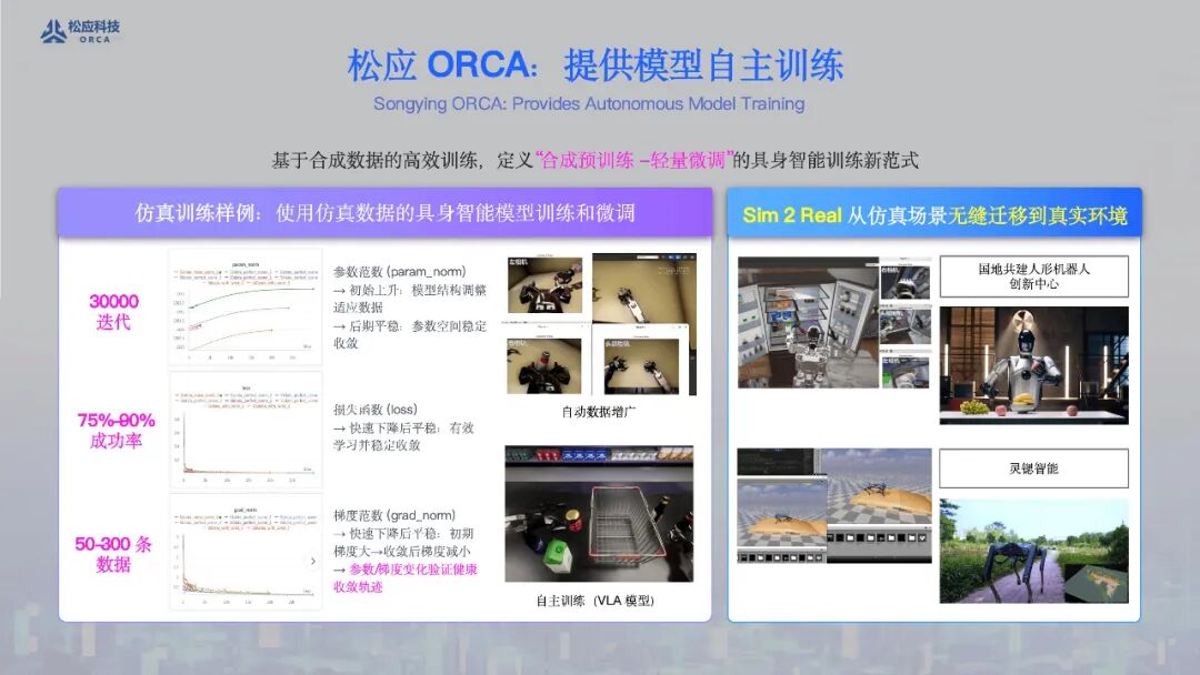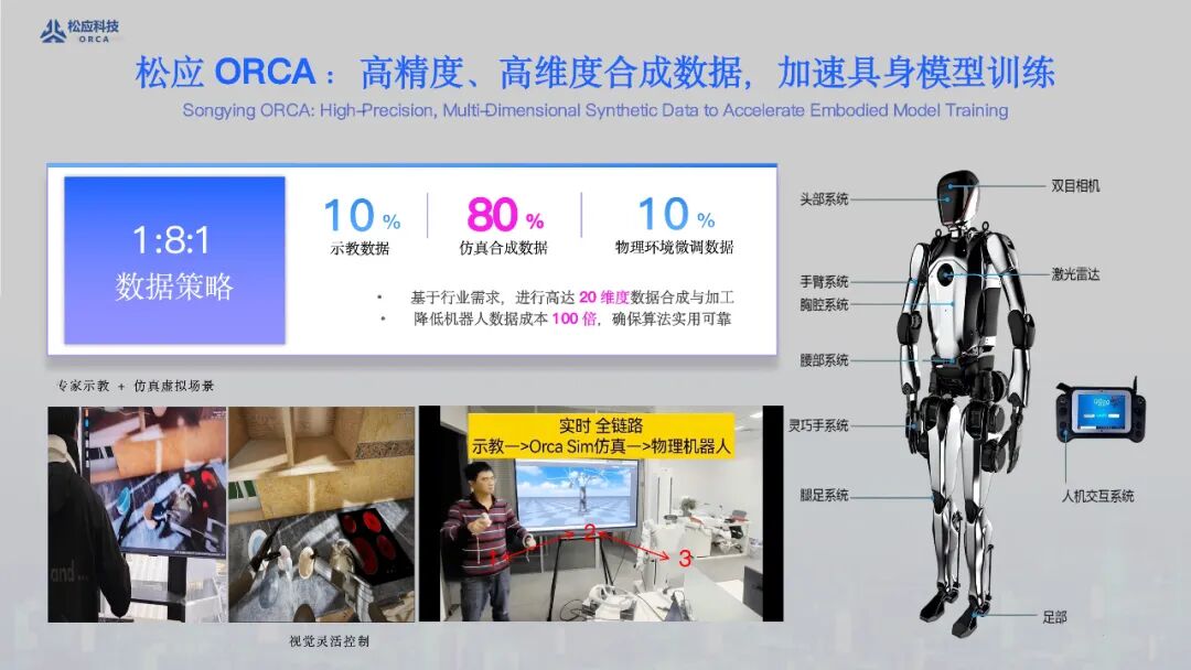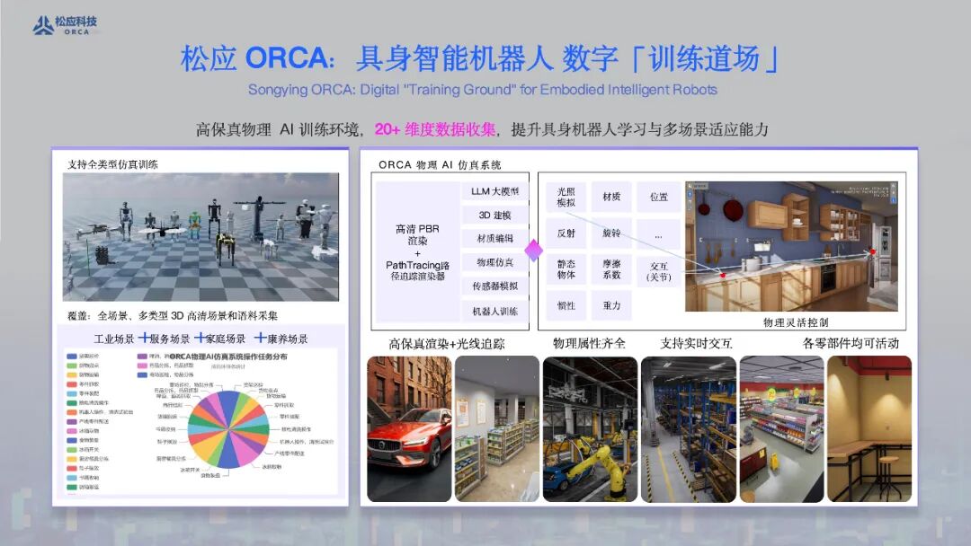 系统支持20+维度数据收集(如视觉、力觉、温度等),并通过“1:8:1”数据策略(10%示教数据、80%仿真合成数据、10%物理微调数据)将训练成本降低100倍。ORCA具备高并发能力(单卡支持4096个机器人并行训练),并已应用于工业制造、康养医疗等场景。