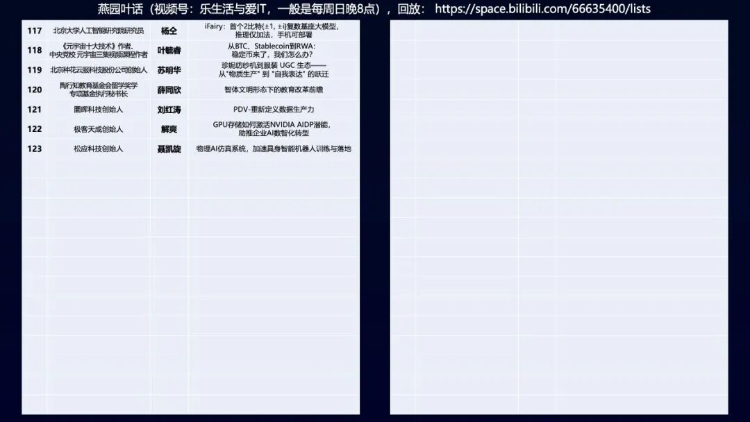人工智能与元宇宙产业委《元宇宙十大技术》培训班是由人工智能与元宇宙产业委副主任委员兼联席秘书长、物链芯工程技术研究院元宇宙研究所所长、先进计算产业发展联盟智能计算组组长叶毓睿发起和创办的。叶毓睿长期关注区块链、VR/AR、AIGC、数字孪生、3D内容创作平台或规范(如Web3D、WebXR)等元宇宙等前沿技术领衔参与撰写的《元宇宙十大技术》一书系统地剖析了构成元宇宙的技术组成、原理、案例和未来趋势。他领衔并邀请了十多位领域的Top级专家撰写的《元宇宙十大技术》一书,系统地剖析了构成元宇宙的核心技术要点,该书得到了包括朱嘉明、肖风、姚前及四位院士等70多位资深专家的联袂推荐。 通过“燕园叶话”这个平台,叶毓睿希望能够推动元宇宙技术在社会各界的交流与普及。《元宇宙十大技术》一书为这个系列活动提供了理论基础和技术支撑。同时,叶毓睿还积极运用自己的人脉资源,邀请国内外元宇宙领域的专家学者前来主讲,保证了内容的专业性和前瞻性。截止2025年11月2日,已经举办了第123期,促成了不少合作,欢迎关注、转发。通过关注视频号 乐生活与爱IT,可以查看过往回放。