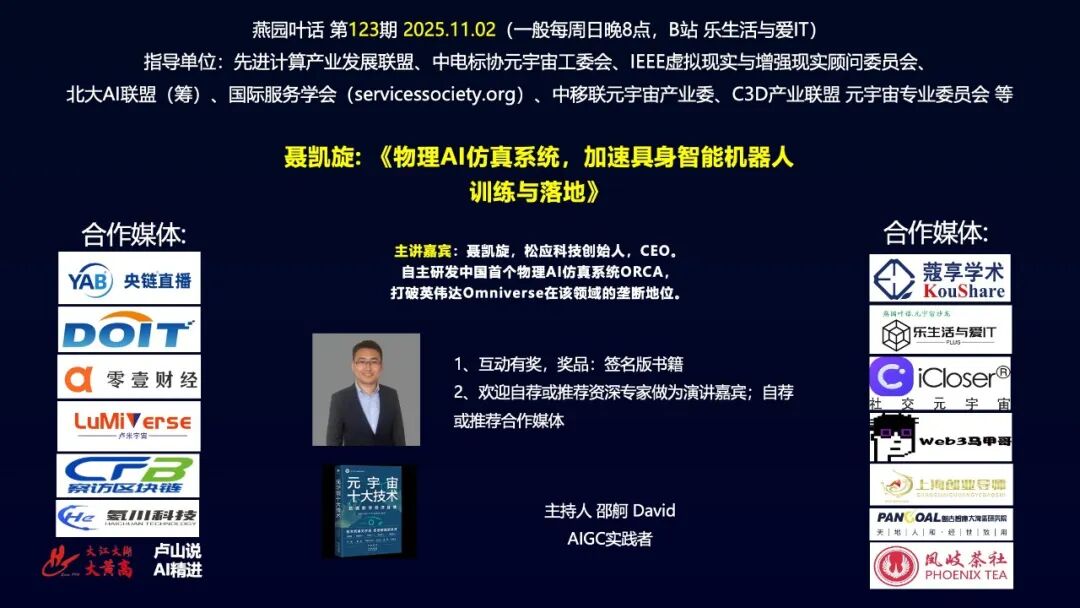 2025年11月2日周日晚上八点,由人工智能与元宇宙产业委(“中国移动通信联合会人工智能与元宇宙产业工作委员会”的简称)指导,人工智能与元宇宙产业委副主任委员兼联席秘书长、物链芯工程技术研究院元宇宙研究所所长叶毓睿创办的“燕园叶话”《元宇宙十大技术》培训班进行到第123期。微信视频号 乐生活与爱IT、央链直播、寇享学术、DOIT、零壹财经、iCloser社交元宇宙、卢米宇宙、察访区块链、web3马甲哥、上海创业导师、盘古智库、氦川科技、大江大湖大黄高、卢山说AI精进、凤岐茶社等媒体直播或转载。客座嘉宾聂凯旋讲解《物理AI仿真系统,加速具身智能机器人训练与落地》,本期超4300人在线观看。