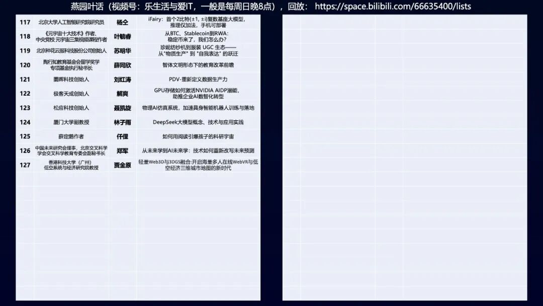 人工智能与元宇宙产业委《元宇宙十大技术》培训班是由人工智能与元宇宙产业委副主任委员兼联席秘书长、物链芯工程技术研究院元宇宙研究所所长、先进计算产业发展联盟智能计算组组长叶毓睿发起和创办的。叶毓睿长期关注区块链、VR/AR、AIGC、数字孪生、3D内容创作平台或规范(如Web3D、WebXR)等元宇宙等前沿技术领衔参与撰写的《元宇宙十大技术》一书系统地剖析了构成元宇宙的技术组成、原理、案例和未来趋势。他领衔并邀请了十多位领域的Top级专家撰写的《元宇宙十大技术》一书,系统地剖析了构成元宇宙的核心技术要点,该书得到了包括朱嘉明、肖风、姚前及四位院士等70多位资深专家的联袂推荐。 通过“燕园叶话”这个平台,叶毓睿希望能够推动元宇宙技术在社会各界的交流与普及。《元宇宙十大技术》一书为这个系列活动提供了理论基础和技术支撑。同时,叶毓睿还积极运用自己的人脉资源,邀请国内外元宇宙领域的专家学者前来主讲,保证了内容的专业性和前瞻性。截止2025年12月7日,已经举办了第127期,促成了不少合作,欢迎关注、转发。通过关注视频号 乐生活与爱IT,可以查看过往回放。