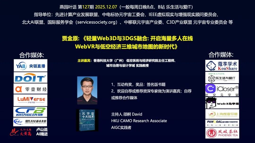 2025年12月7日周日晚上八点,由人工智能与元宇宙产业委(“中国移动通信联合会人工智能与元宇宙产业工作委员会”的简称)指导,人工智能与元宇宙产业委副主任委员兼联席秘书长、物链芯工程技术研究院元宇宙研究所所长叶毓睿创办的“燕园叶话”《元宇宙十大技术》培训班进行到第127期。微信视频号 乐生活与爱IT、央链直播、寇享学术、DOIT、零壹财经、iCloser社交元宇宙、卢米宇宙、察访区块链、web3马甲哥、上海创业导师、盘古智库、氦川科技、大江大湖大黄高、卢山说AI精进、凤岐茶社等媒体直播或转载。客座嘉宾贾金原讲解《轻量Web3D与3DGS融合: 开启多人在线WebVR新时代》,本期超1600人在线观看。