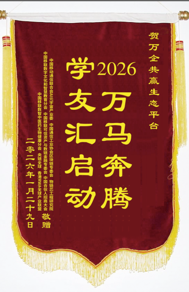 中国移联AI元宇宙产业委、中国移联数字文化和智慧教育分会、中国通信工业协会区块链专业委员会、中国移联可信资产与数链金融专委会、中国合伙人招商大会、中国移联数智中医药生物健康分会、央链全球、香港RWA全球产业联盟等多家权威协会与机构,向学友汇的成立致以热烈祝贺。万企共赢生态平台29期学员、中国移联AI元宇宙产业委等机构秘书长何超代表以上协会与机构,现场送上题有“2026万马奔腾 学友汇启动”的锦旗,表示愿以多元领域资源合力,为学友汇生态新平台注入强劲发展动能。