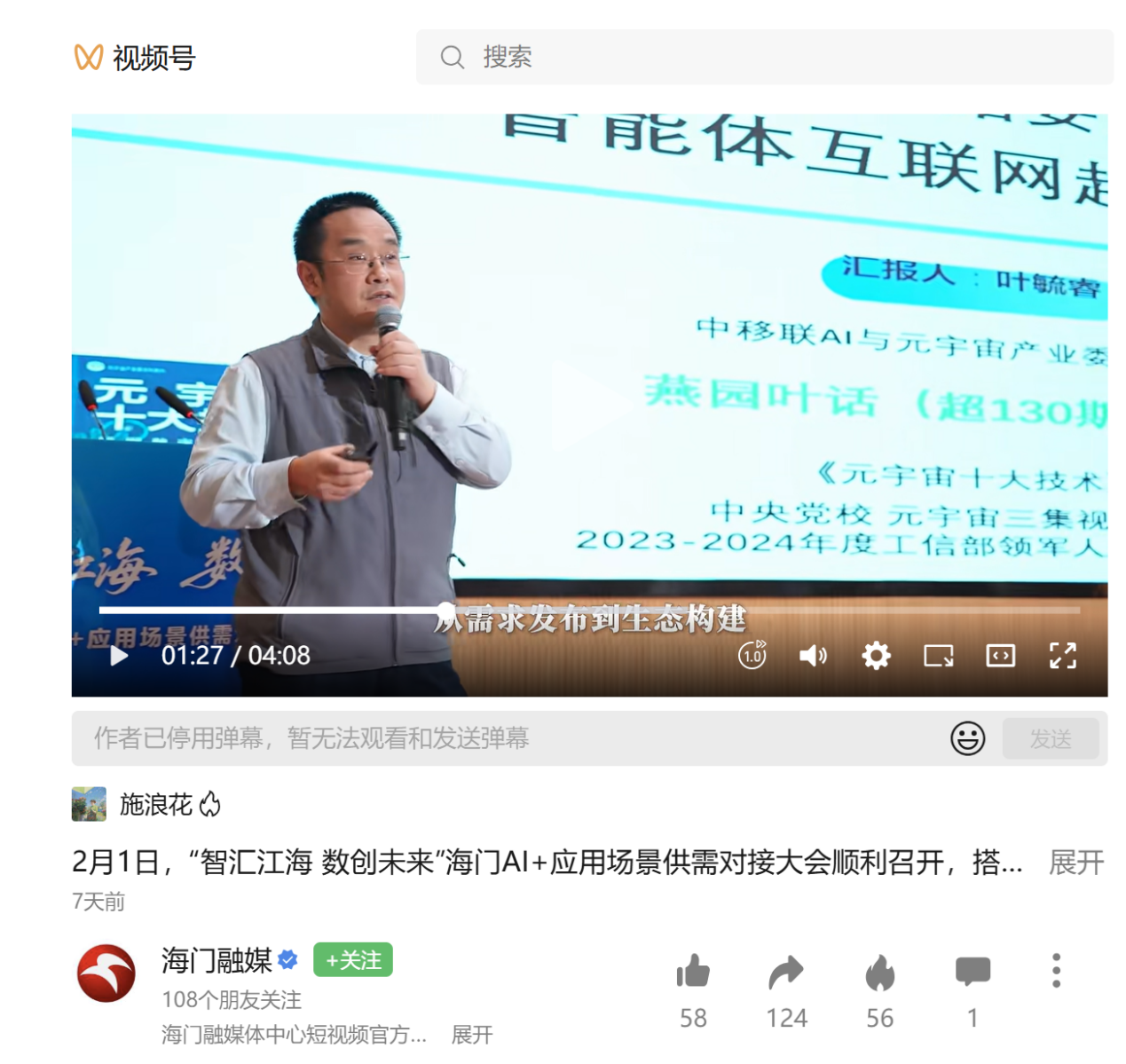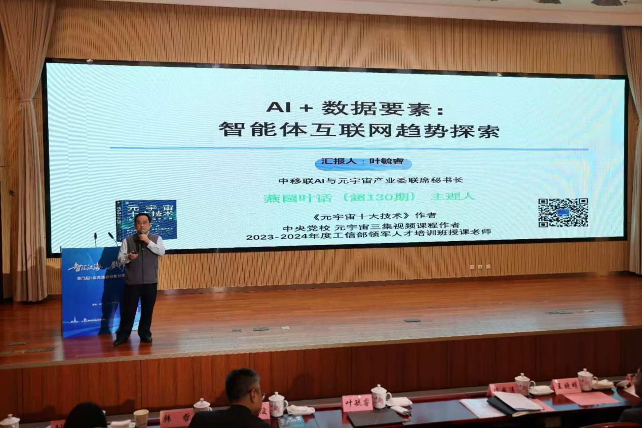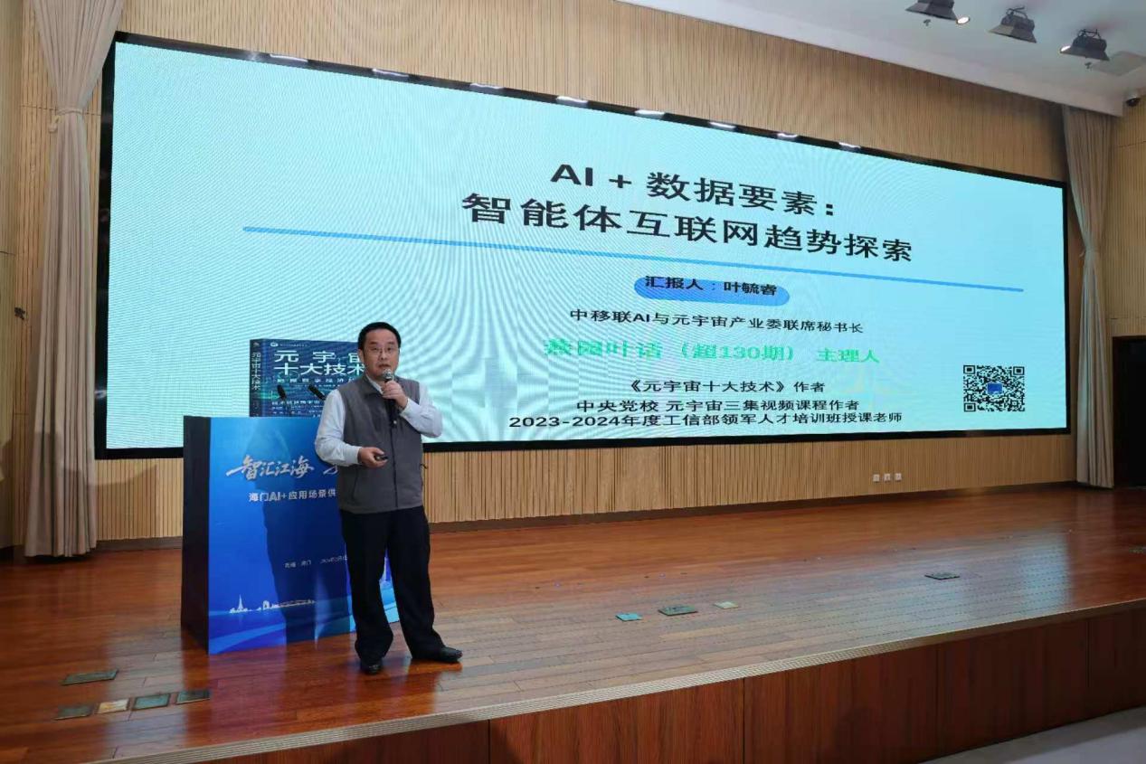 沈旭东、王晓明,陈威涛、刘威分别为“海门人工智能产业服务中心”“海门人工智能OPC社区”揭牌。叶毓睿作了题为《AI+数据要素:智能体互联网趋势探索》演讲。