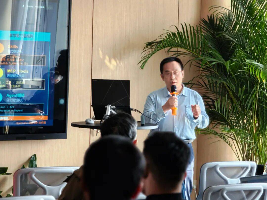 中国移动通信联合会人工智能与元宇宙产业委联席秘书长、《元宇宙十大技术》作者、燕园叶话主理人、中央党校元宇宙三集视频课程作者、人社部AIGC认证师资叶毓睿老师率先开讲。他从开源生态与AI发展的宏观视角切入,深度解读OpenClaw迅速走红的内在逻辑,从智能体互联网与Skills能力市场等角度,剖析其成为现象级项目的深刻原因,并前瞻其在企业级应用中的演进方向,为整场沙龙奠定了认知基础。
