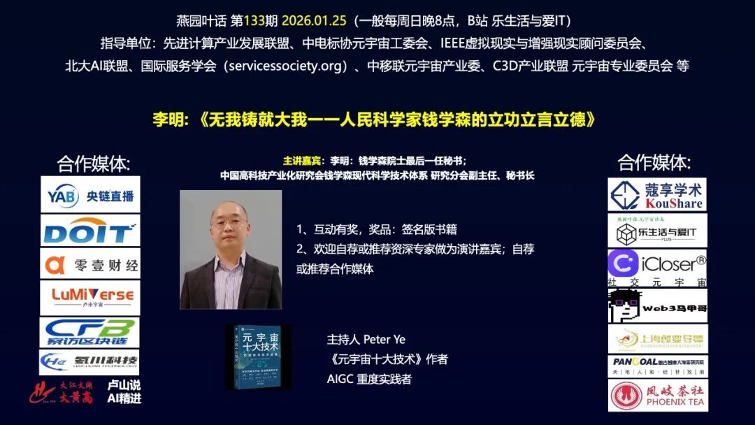 2026年1月25日周日晚上八点,由人工智能与元宇宙产业委(“中国移动通信联合会人工智能与元宇宙产业工作委员会”的简称)指导,人工智能与元宇宙产业委副主任委员兼联席秘书长、物链芯工程技术研究院元宇宙研究所所长叶毓睿创办的“燕园叶话”《元宇宙十大技术》培训班进行到第133期。微信视频号 乐生活与爱IT、央链直播、寇享学术、DOIT、零壹财经、iCloser社交元宇宙、卢米宇宙、察访区块链、web3马甲哥、上海创业导师、盘古智库、氦川科技、大江大湖大黄高、卢山说AI精进、凤岐茶社等媒体直播或转载。客座嘉宾李明讲解《无我铸就大我——人民科学家钱学森的立功立言立德》,本期超3400人在线观看。