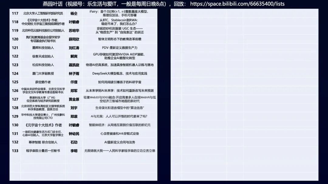 人工智能与元宇宙产业委《元宇宙十大技术》培训班是由人工智能与元宇宙产业委副主任委员兼联席秘书长、物链芯工程技术研究院元宇宙研究所所长、先进计算产业发展联盟智能计算组组长叶毓睿发起和创办的。叶毓睿长期关注区块链、VR/AR、AIGC、数字孪生、3D内容创作平台或规范(如Web3D、WebXR)等元宇宙等前沿技术领衔参与撰写的《元宇宙十大技术》一书系统地剖析了构成元宇宙的技术组成、原理、案例和未来趋势。他领衔并邀请了十多位领域的Top级专家撰写的《元宇宙十大技术》一书,系统地剖析了构成元宇宙的核心技术要点,该书得到了包括朱嘉明、肖风、姚前及四位院士等70多位资深专家的联袂推荐。 通过“燕园叶话”这个平台,叶毓睿希望能够推动元宇宙技术在社会各界的交流与普及。《元宇宙十大技术》一书为这个系列活动提供了理论基础和技术支撑。同时,叶毓睿还积极运用自己的人脉资源,邀请国内外元宇宙领域的专家学者前来主讲,保证了内容的专业性和前瞻性。截止2026年1月25日,已经举办了第133期,促成了不少合作,欢迎关注、转发。通过关注视频号 乐生活与爱IT,可以查看过往回放。