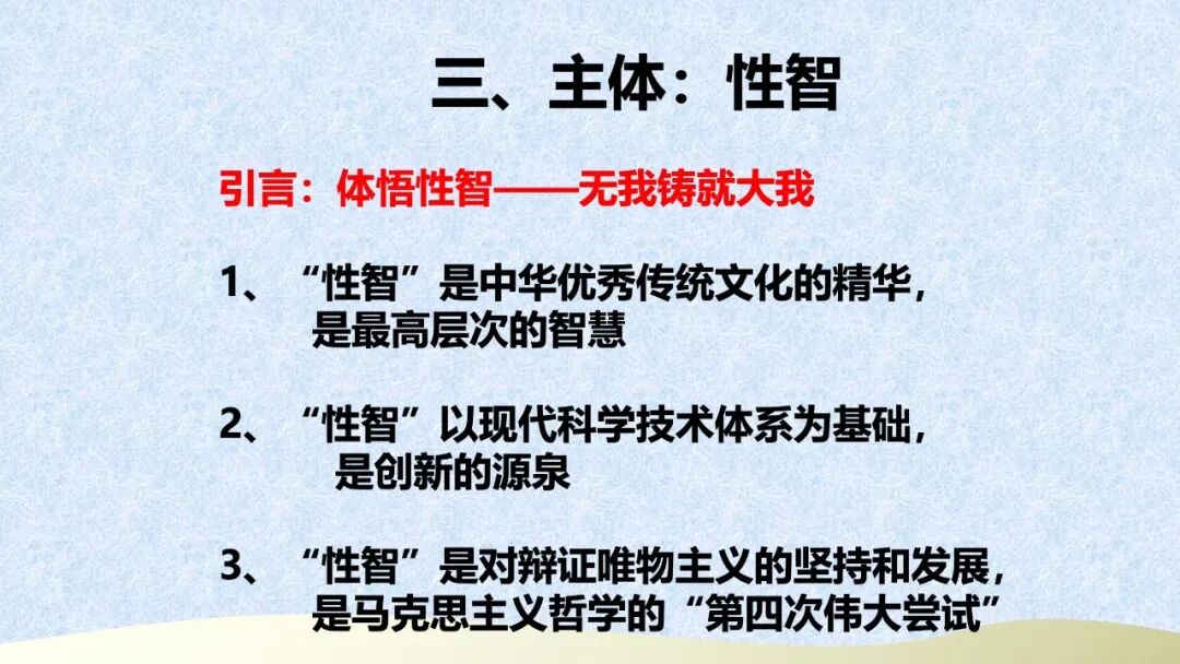 “性智”作为中华传统文化精华,是最高层次的智慧,超越逻辑思维(量智)和形象思维(相智)。李明结合钱学森书信指出,性智需通过修身实践(如站桩)体悟,而非单纯知识积累;它还是马克思主义哲学“第四次伟大尝试”的关键,旨在通过主客合一推动科学范式变革。