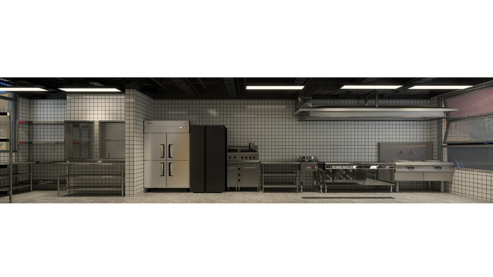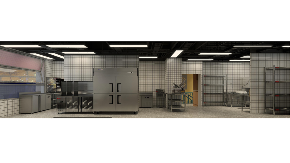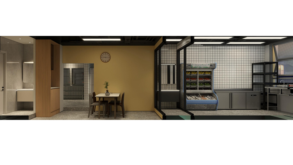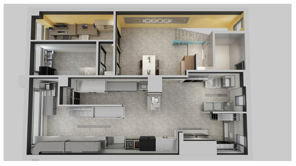 功能设施:备餐柜(6㎡)、收银台(2㎡)、食梯储物操作台(2㎡)、传菜电梯(2部,长度2400)、定制下负一楼门(1个,门宽900)、定制门口档口(1项)、定制楼梯间发光格子架(1项)