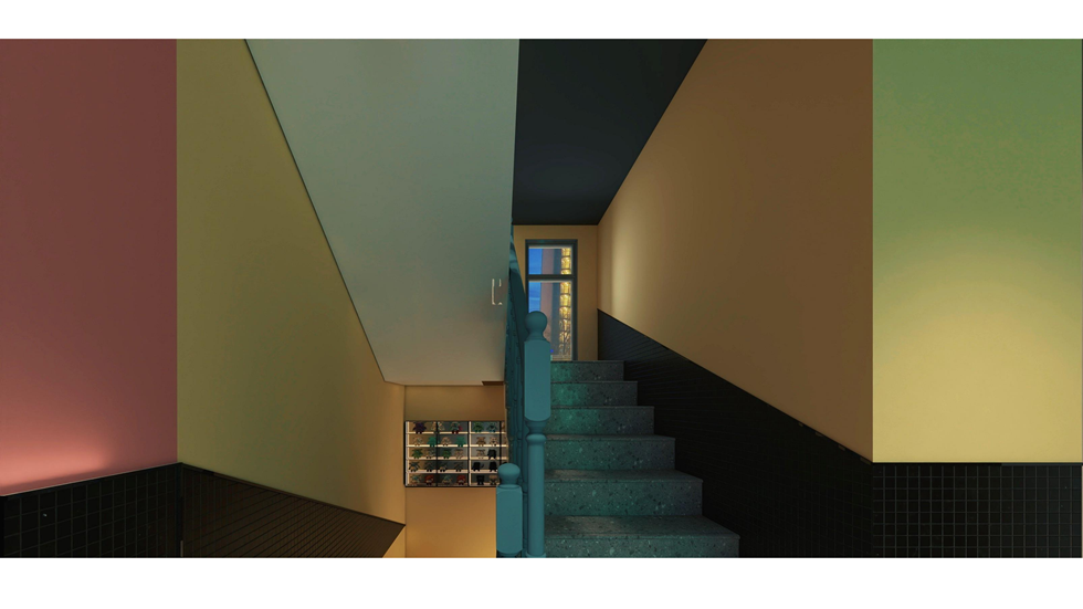 定制隔断:彩虹色铝合金磨砂玻璃隔断(5个)、彩虹色铝合金亚克力管隔断(4个,加灯)、楼梯旁水泥砖隔断(1个)