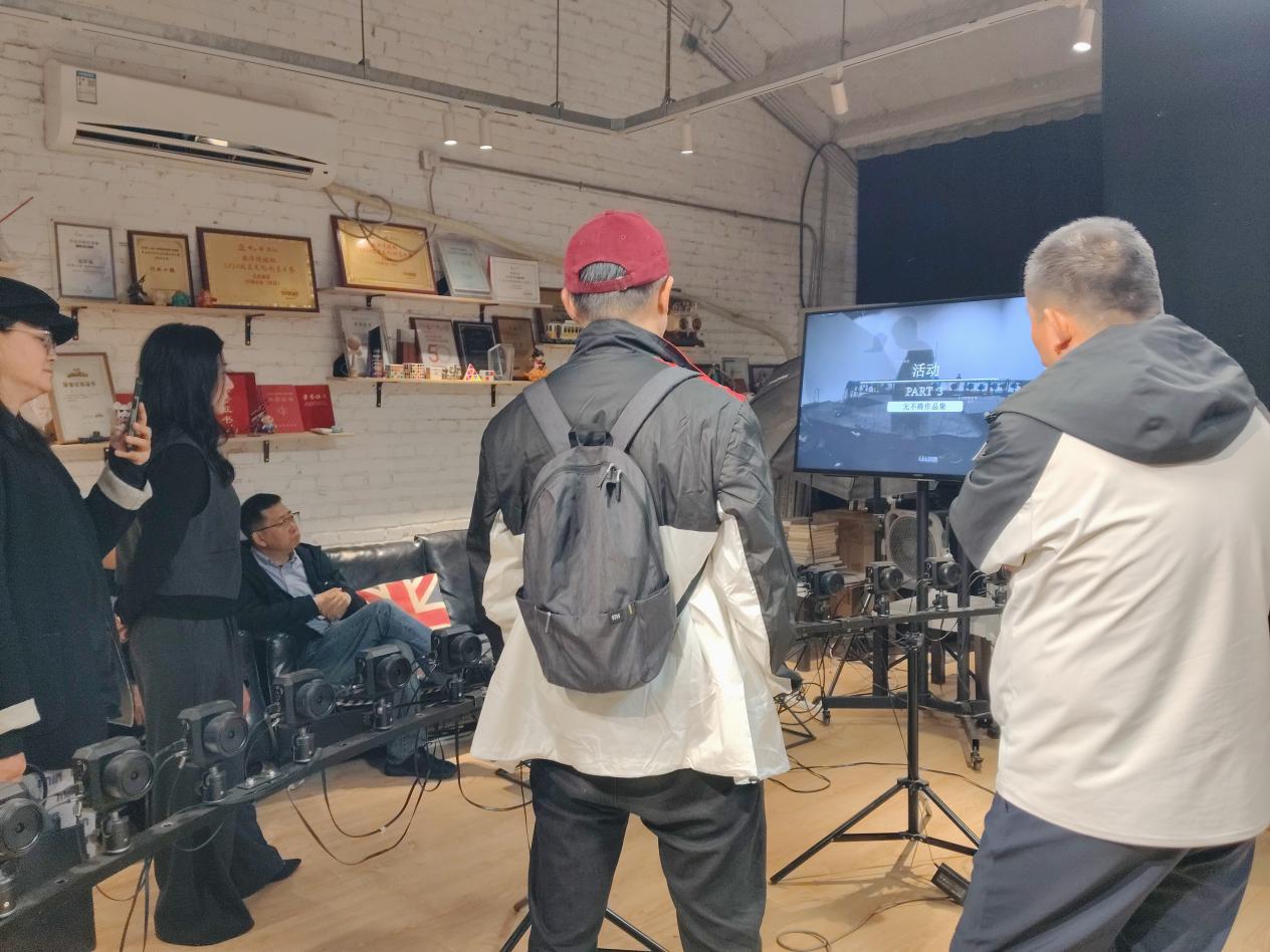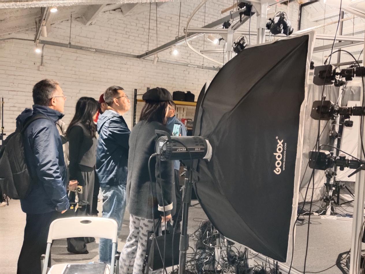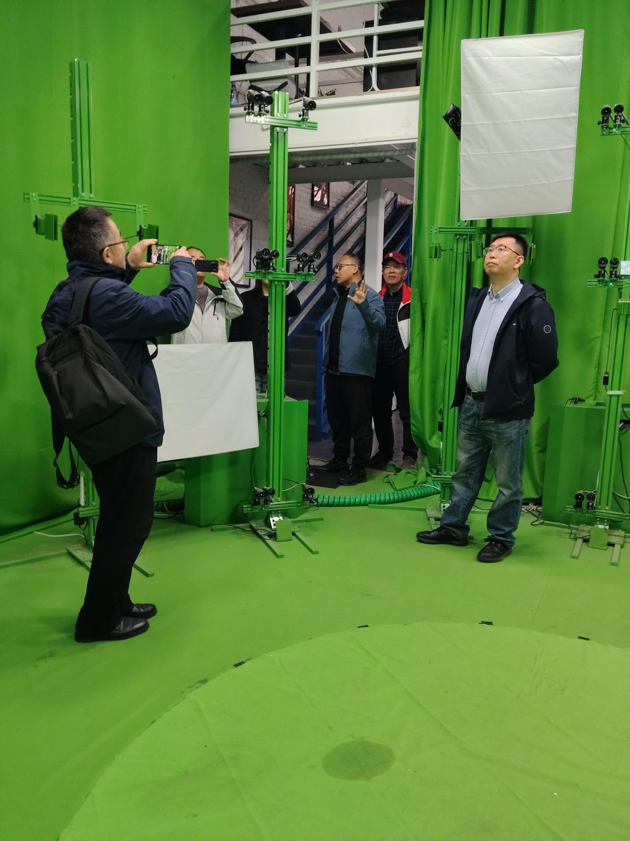 考察团一行现场观摩了北京容积视觉科技有限公司专业容积采集系统、三维数字人制作流程及沉浸式XR 体验设备,亲身体验VR大空间沉浸式演绎、容积数字人交互、AR 实景互动等核心技术成果,直观感受容积视觉在真人三维采集、AI 数字人、元宇宙内容开发等领域的技术实力与应用落地能力。